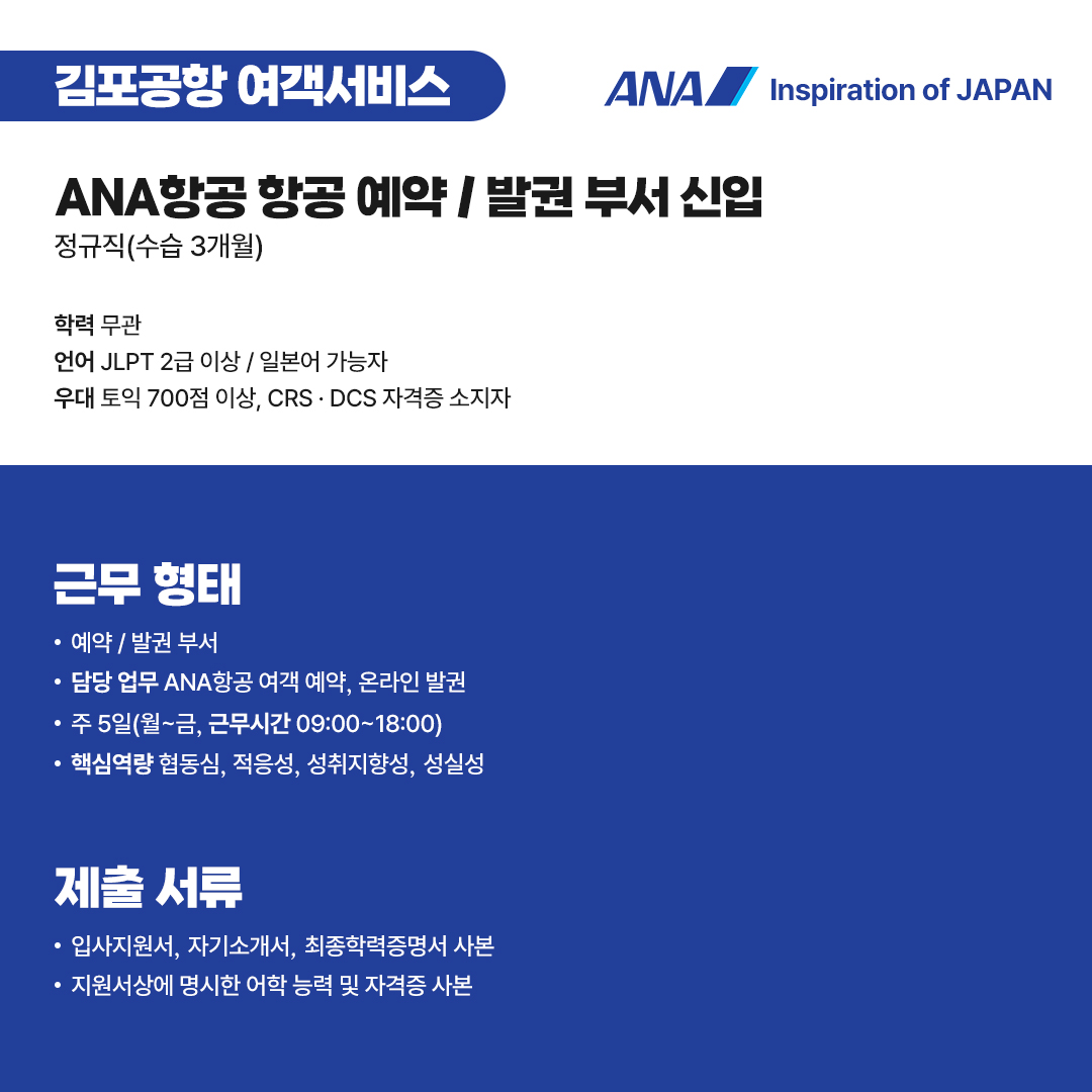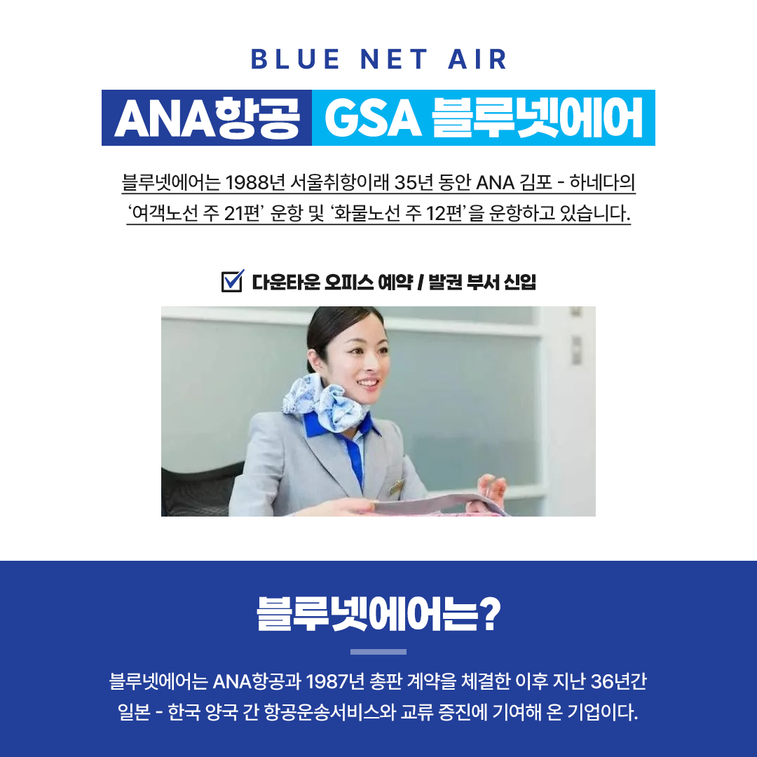 [ANC정회원 추천채용] 일본 ANA항공 GSA 블루넷에어 다운타운 오피스 예약/발권부서 채용