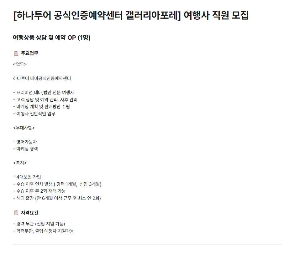 [하나투어 공식인증예약센터 갤러리아포레] 여행사 op 직원 모집