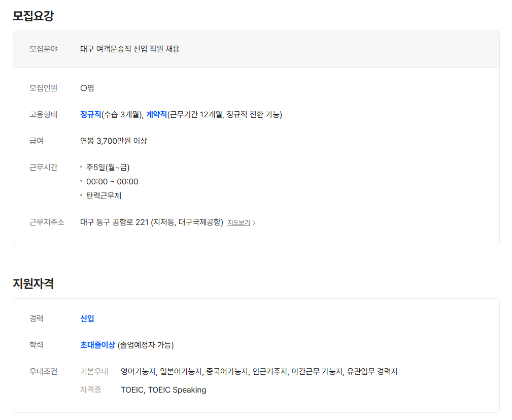 [대한항공] 에어코리아 대구공항 여객운송직 신입 직원 채용  - 연봉3,700