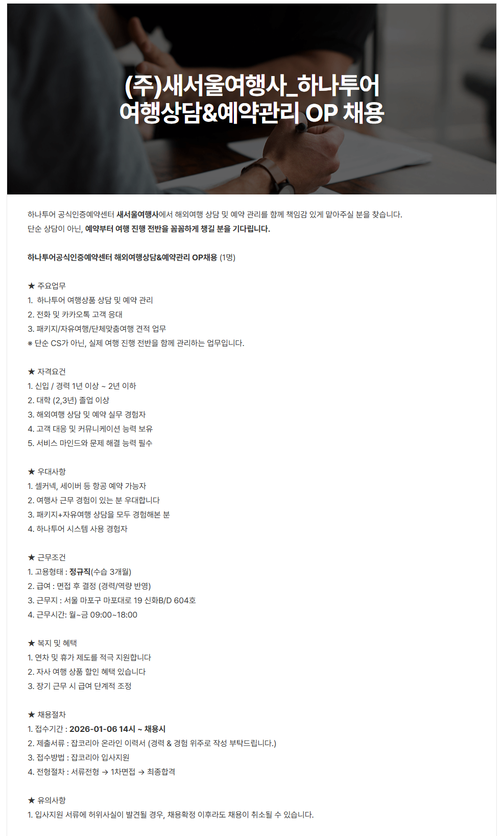 [(주)새서울여행사] 하나투어 여행상담&예약관리 OP 채용