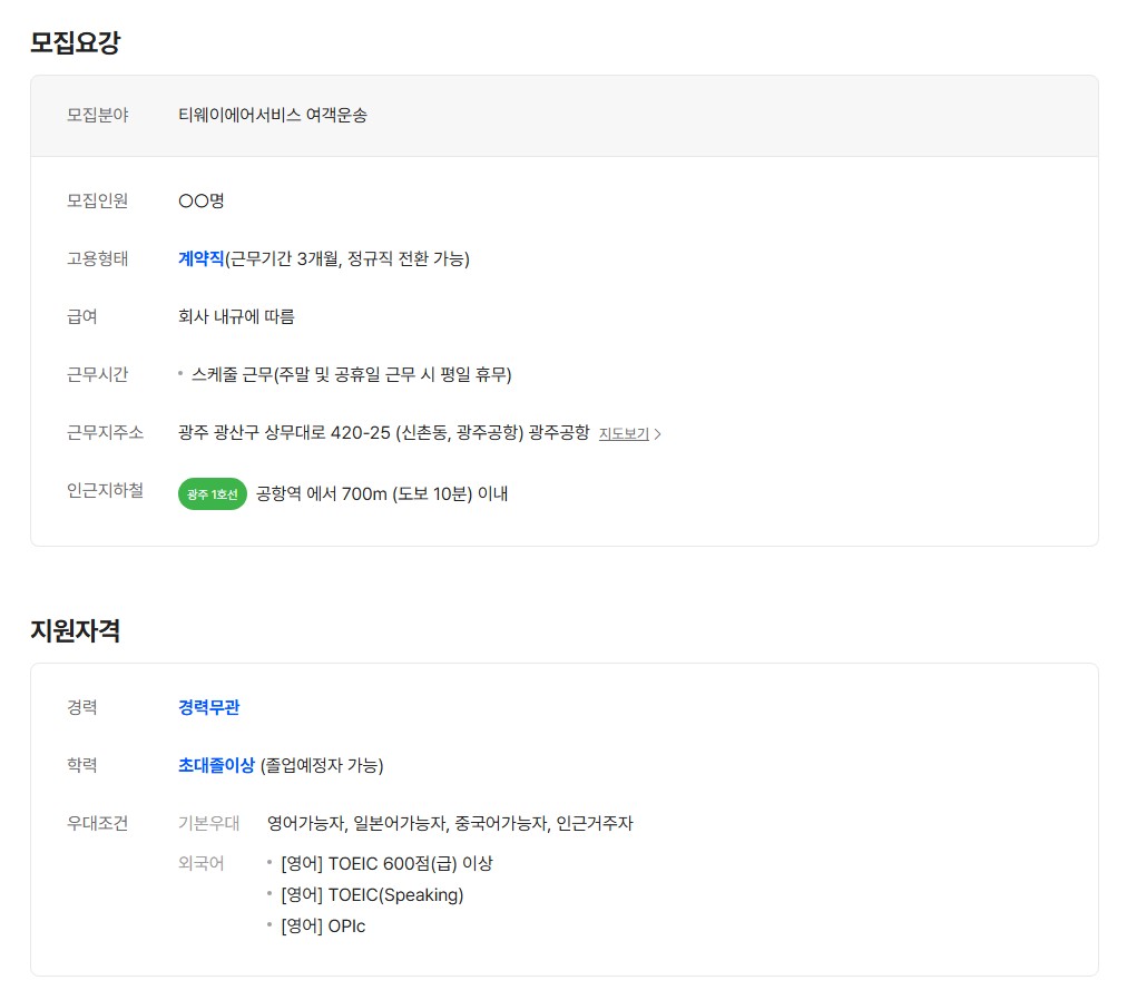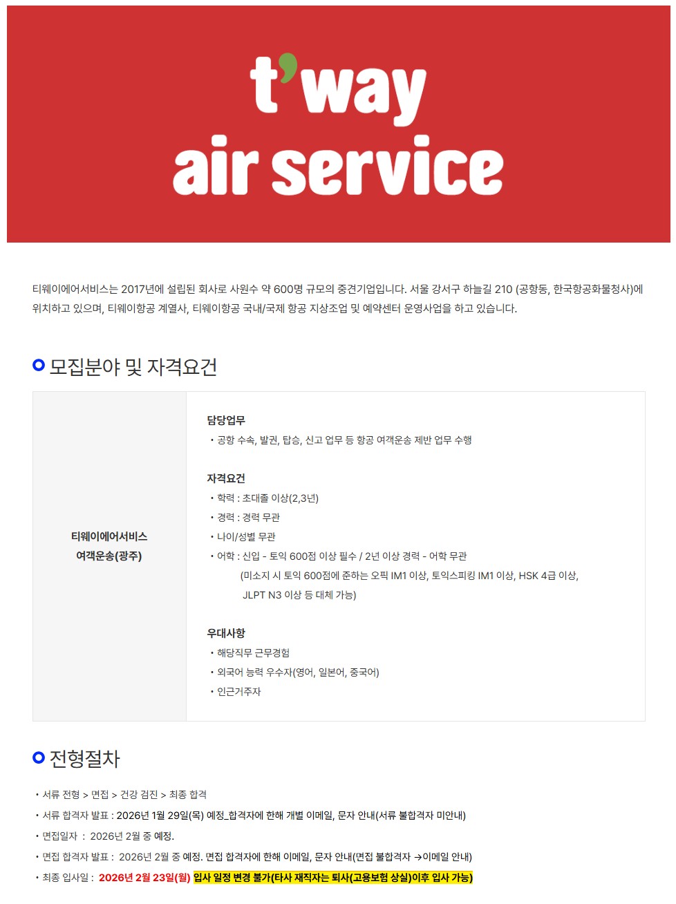 [티웨이항공] 티웨이에어서비스 여객운송직 (광주)