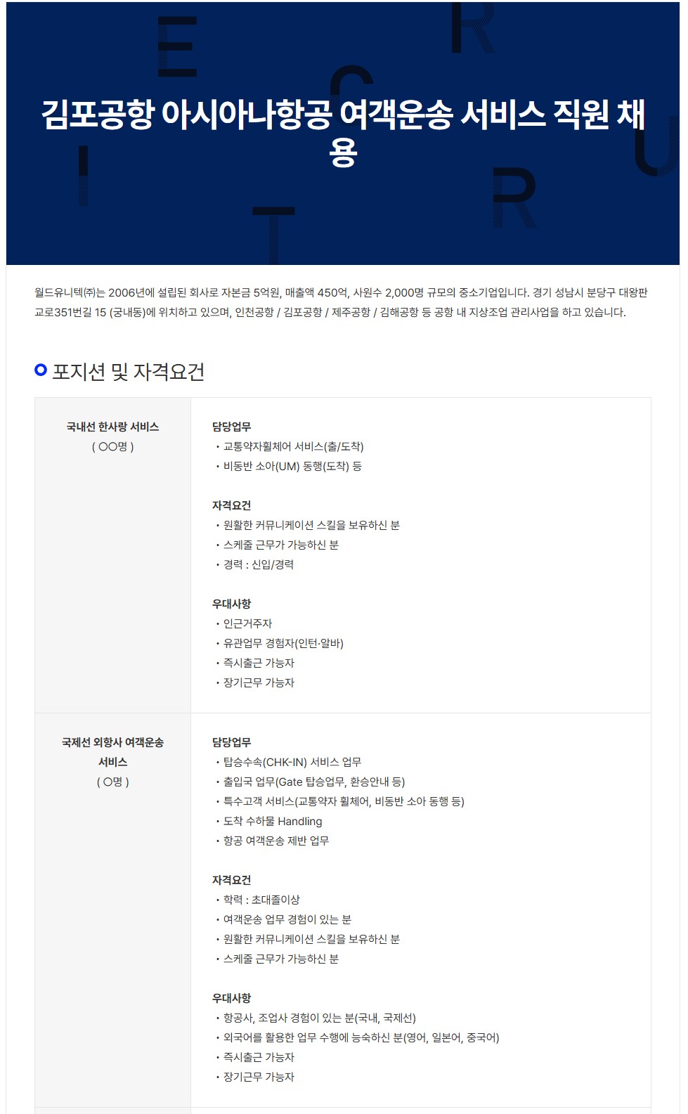 [월드유니텍㈜] 김포공항 아시아나항공 여객운송 서비스 직원 채용