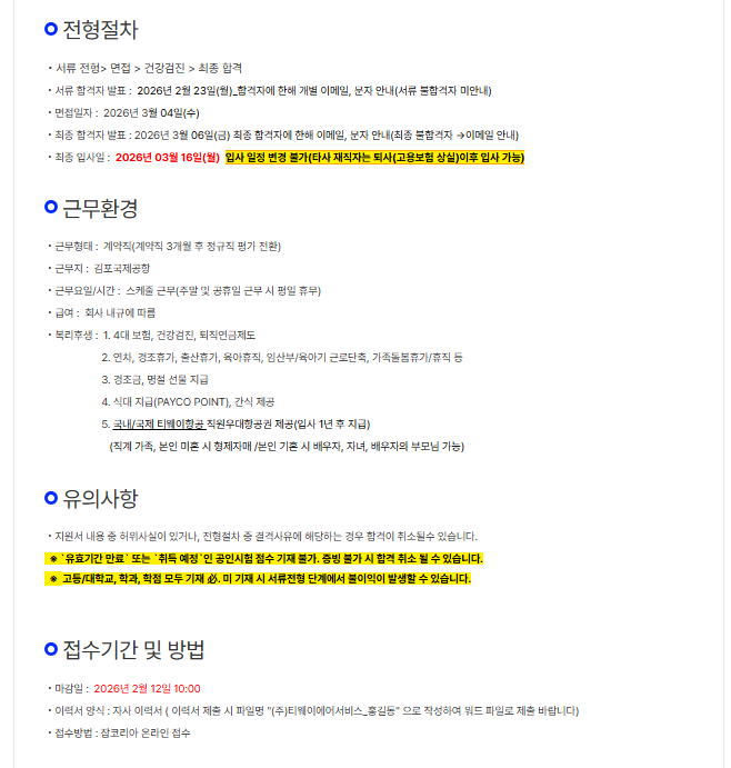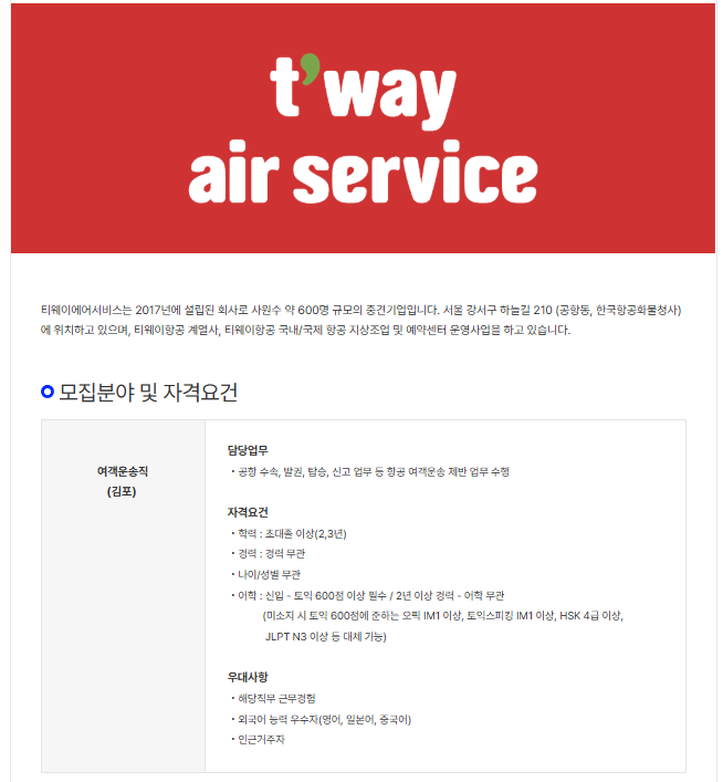 [티웨이항공] 티웨이에어서비스 김포공항 여객운송직 신입 채용