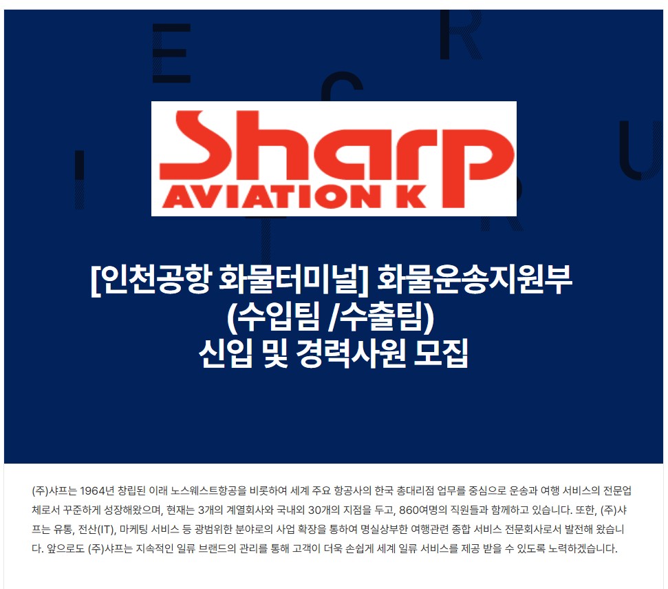 [㈜샤프에비에이션케이] 인천공항 화물운송지원부(수입/수출)신입 및 경력사원 모집