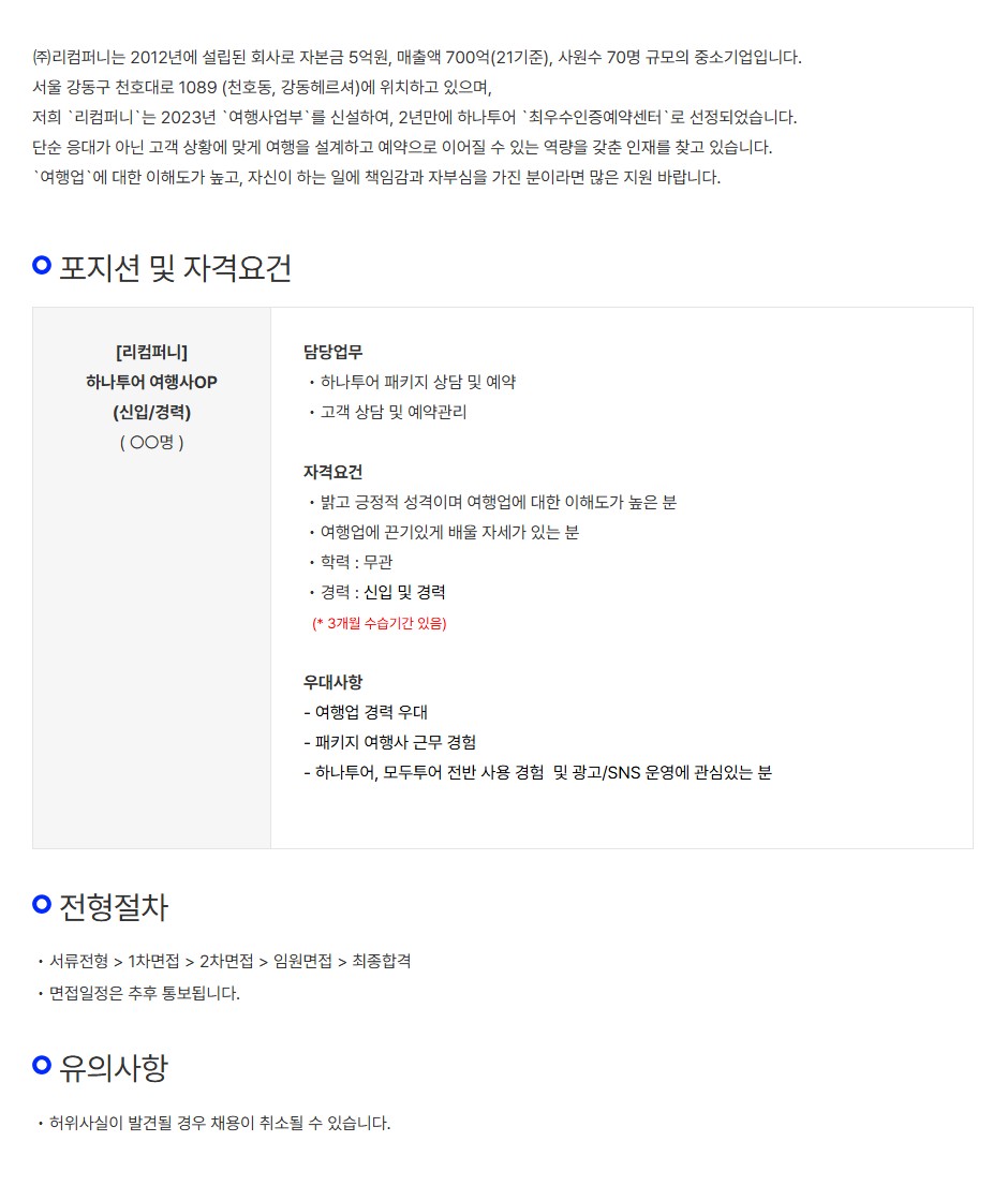 [리컴퍼니투어] 하나투어 여행사 OP 채용(고객상담 및 예약관리)