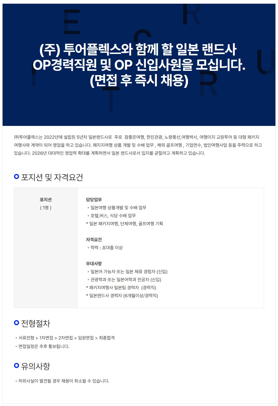 [㈜투어플렉스] 일본 랜드사 경력 및 신입 OP 를 모십니다.