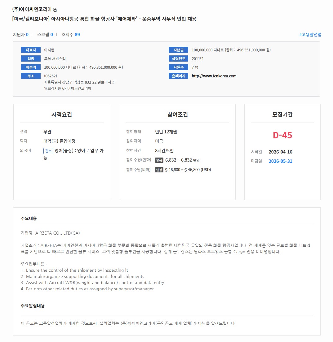 [미국/캘리포니아] 아시아나항공 통합 화물 항공사 '에어제타' - 운송무역 사무직 인턴 채용
