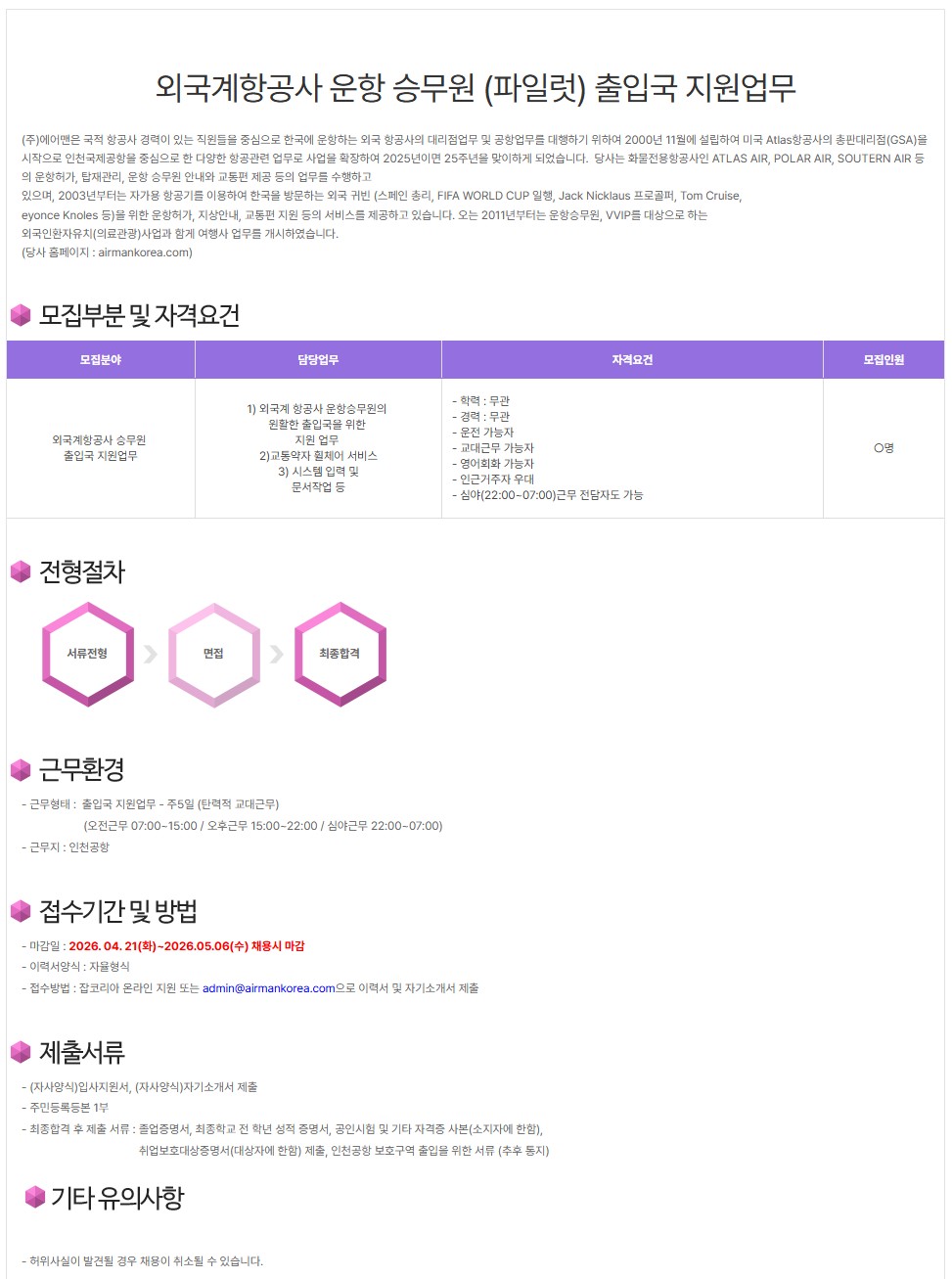 [㈜에어맨] 외국계항공사 운항 승무원 (파일럿) 출입국 지원업무 - 학력무관