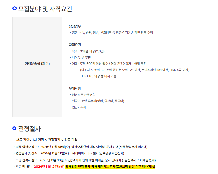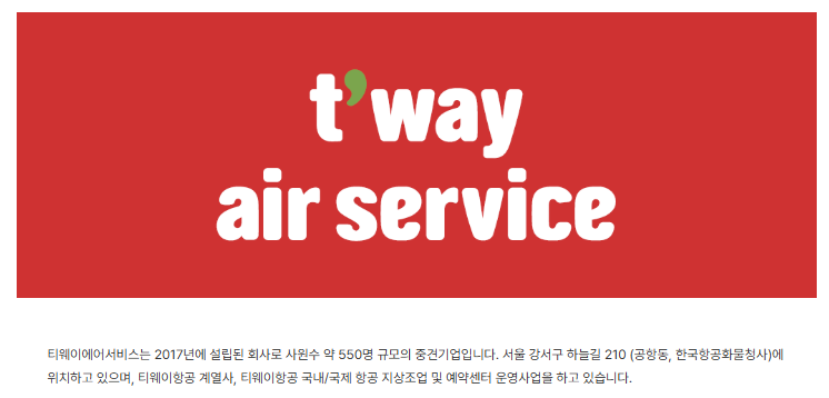[티웨이항공] 티웨이에어서비스 제주 공항 여객운송직 신입 채용