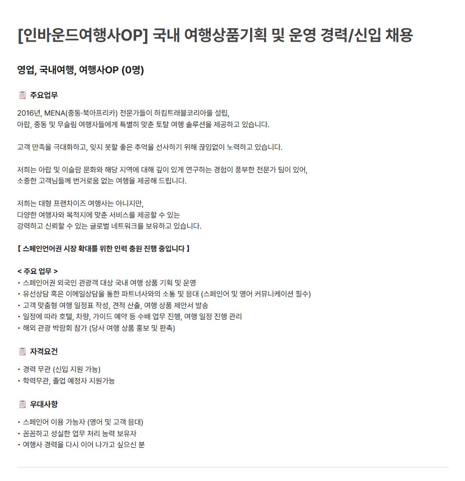 [하킴트래블코리아] 인바운드여행사OP 국내 여행상품기획 및 운영 경력/신입 채용