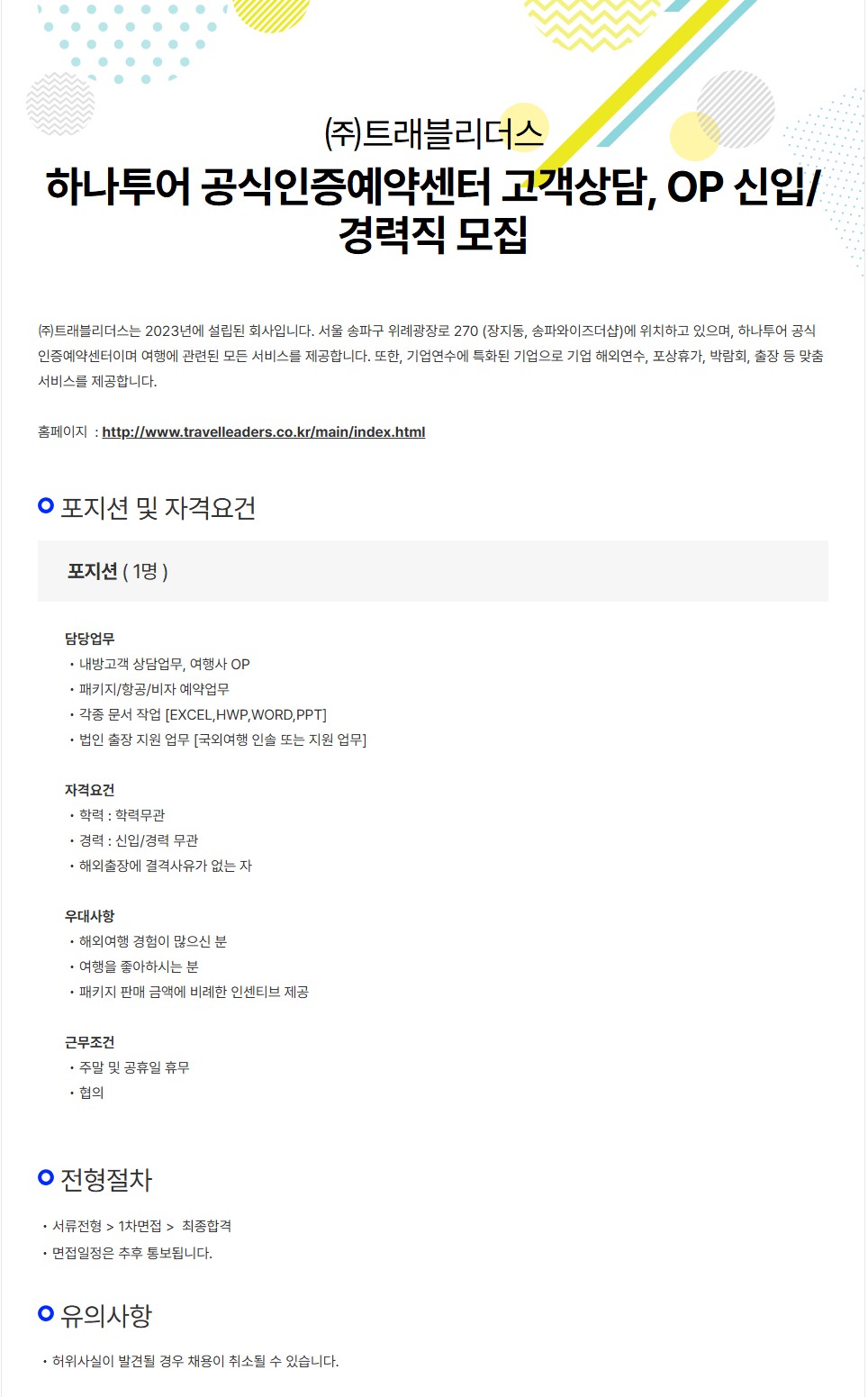 [㈜트래블리더스] 하나투어 공식인증예약센터 여행사 고객상담, OP 신입/경력직 모집