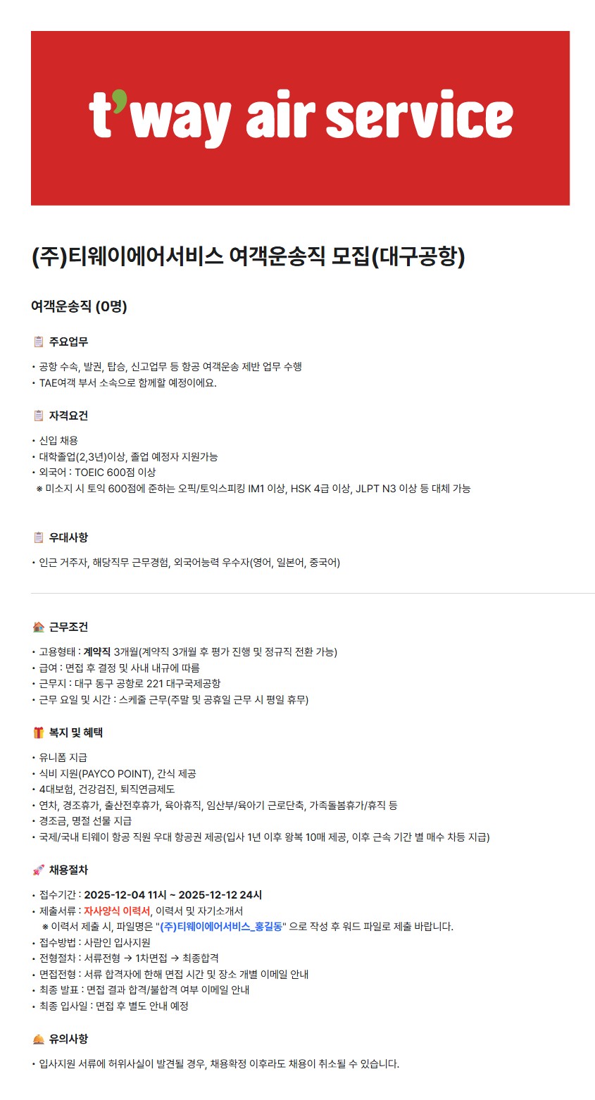 [티웨이항공] 티웨이에어서비스 여객운송직 모집 - 대구공항