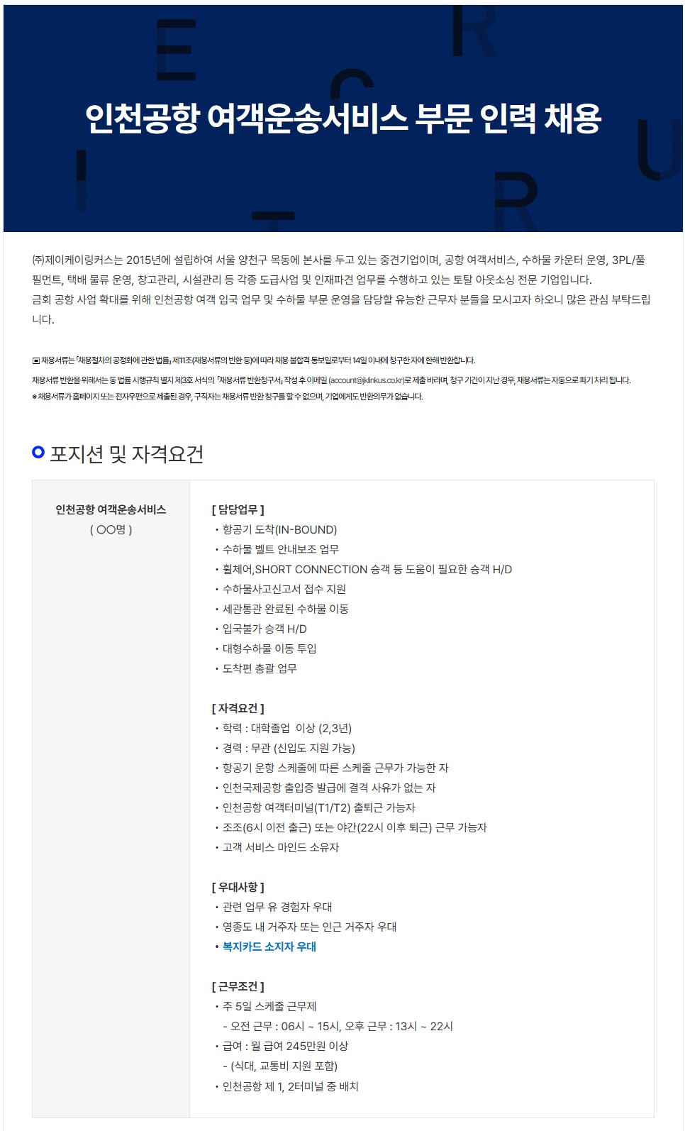 [㈜제이케이링커스] 인천공항 여객운송서비스 부문 인력 채용 - 학력,어학 조건 없음
