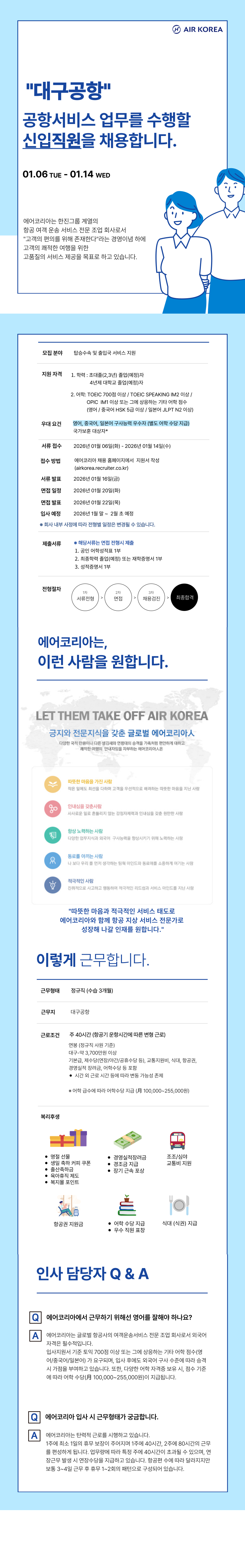 [대한항공] 에어코리아 대구공항 여객운송직 신입 직원 채용  - 연봉3,700