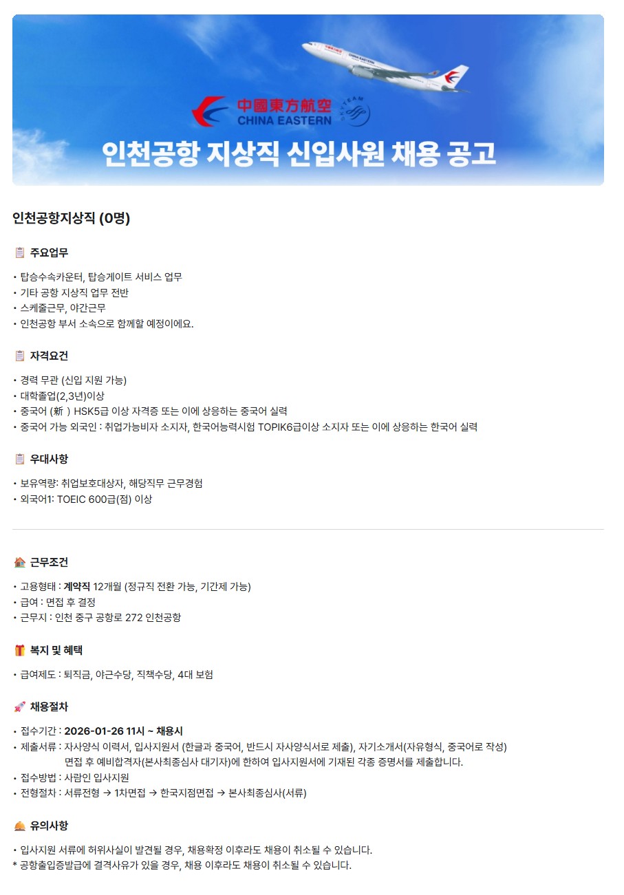 [중국동방항공] 인천공항지점 지상직 신입 사원 모집