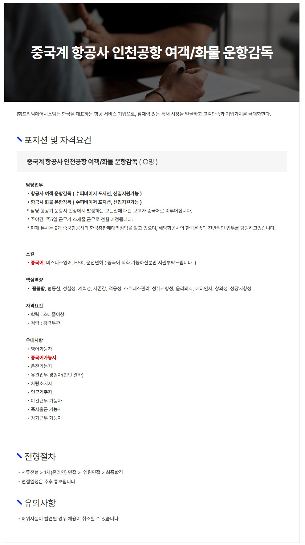 [㈜프리덤에어시스템] 중국계 항공사 인천공항 여객/화물 운항업무