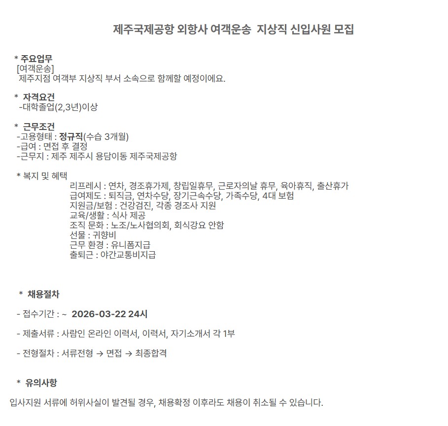 [㈜샤프에비에이션케이] 제주공항 외항사 여객운송 지상직 신입사원 모집