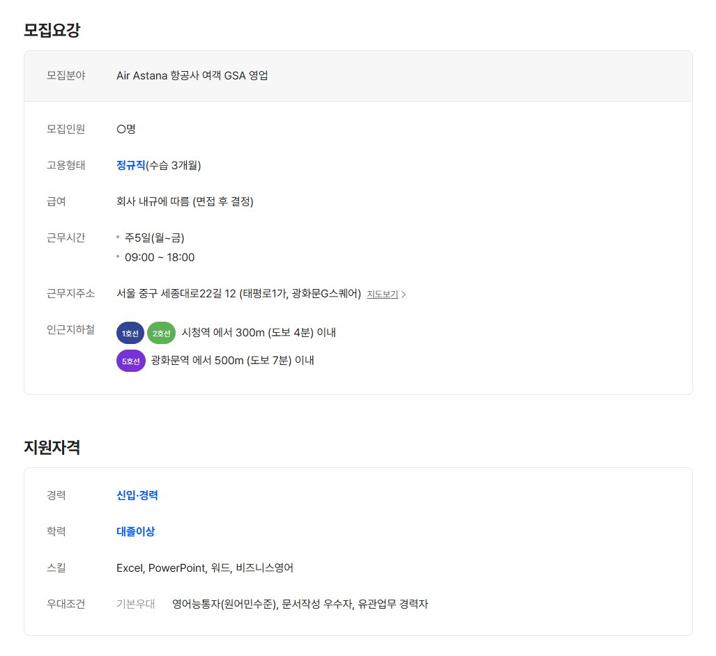 [㈜샤프에비에이션케이] Air Astana 항공사 여객 GSA 영업 및 영업지원 모집