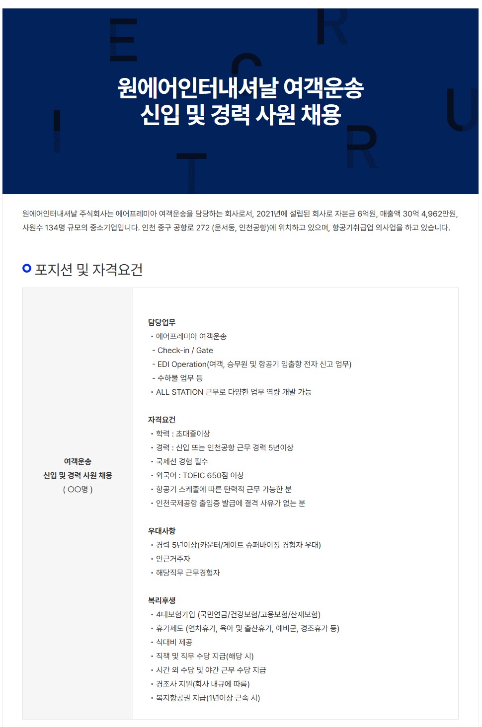 [원에어인터내셔날] 에어프레미아 여객운송 신입 및 경력 사원 채용