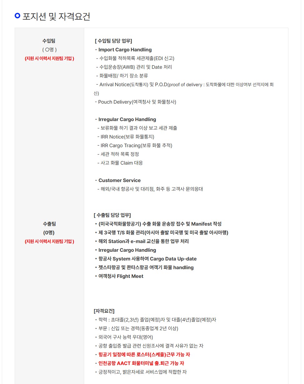 [㈜샤프에비에이션케이] 인천공항 화물운송지원부(수입/수출)신입 및 경력사원 모집