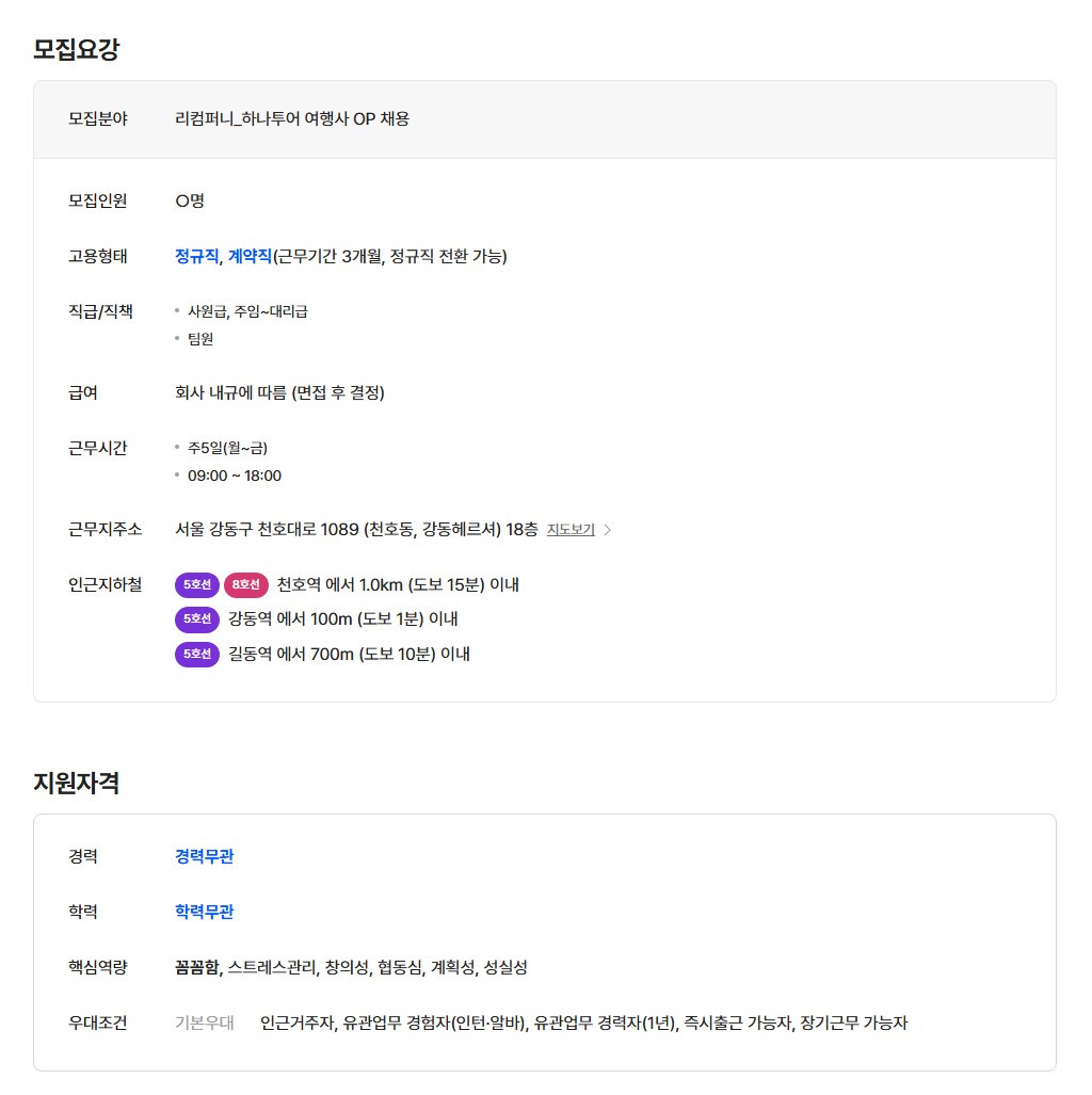 [리컴퍼니투어] 하나투어 여행사 OP 채용(고객상담 및 예약관리)