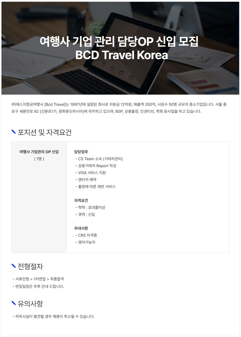 [㈜에스지항공여행사 Bcd Travel] 여행사 기업 관리 담당OP 신입 모집 BCD Travel Korea