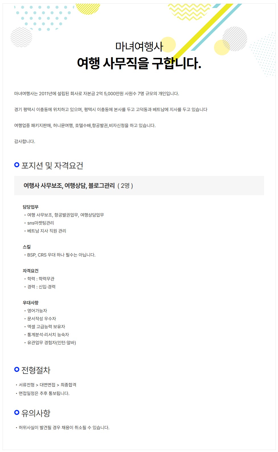 [마녀여행사] 안녕하세요 마녀여행사와 함께 할 여행사무 직원 구합니다.