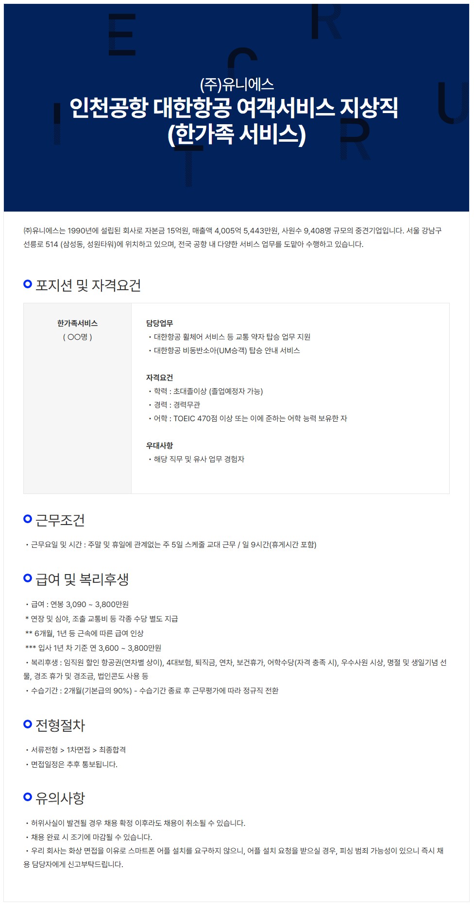 [㈜유니에스] 인천공항 대한항공 여객서비스 지상직 (한가족 서비스)