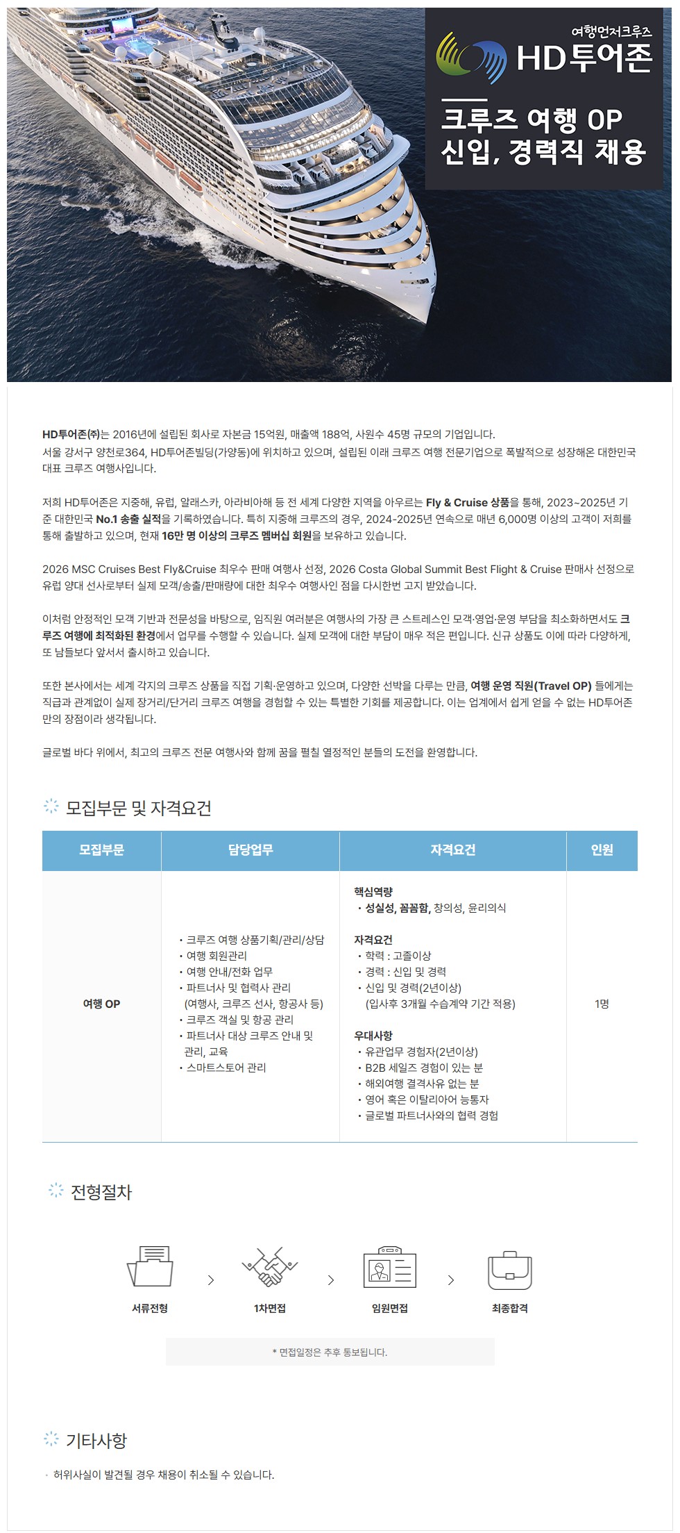 [HD투어존] 신입, 경력직 OP / 여행사 크루즈여행 상품/파트너사 관리