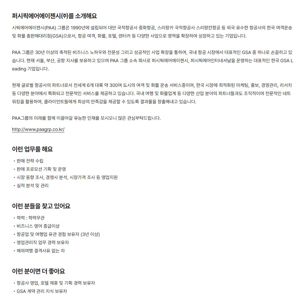 [퍼시픽에어에이젠시㈜] 항공여객영업관리