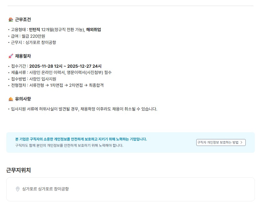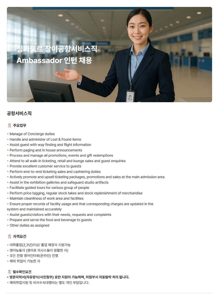 [베스트커리어플러스] 싱가포르 창이공항 공항서비스직 인턴 채용