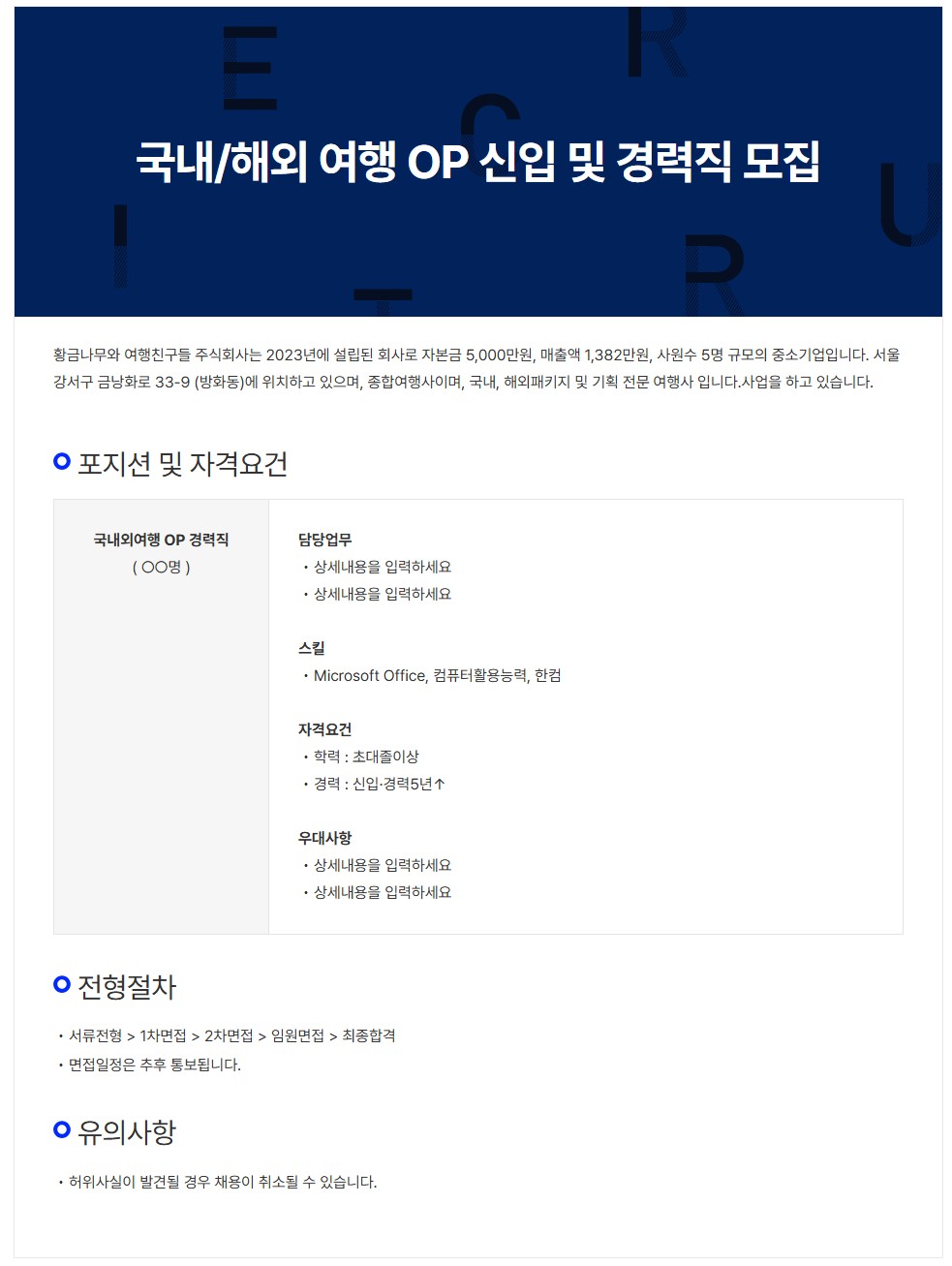 [황금나무와 여행친구들] 국내/해외 여행 OP 신입 및 경력직 모집