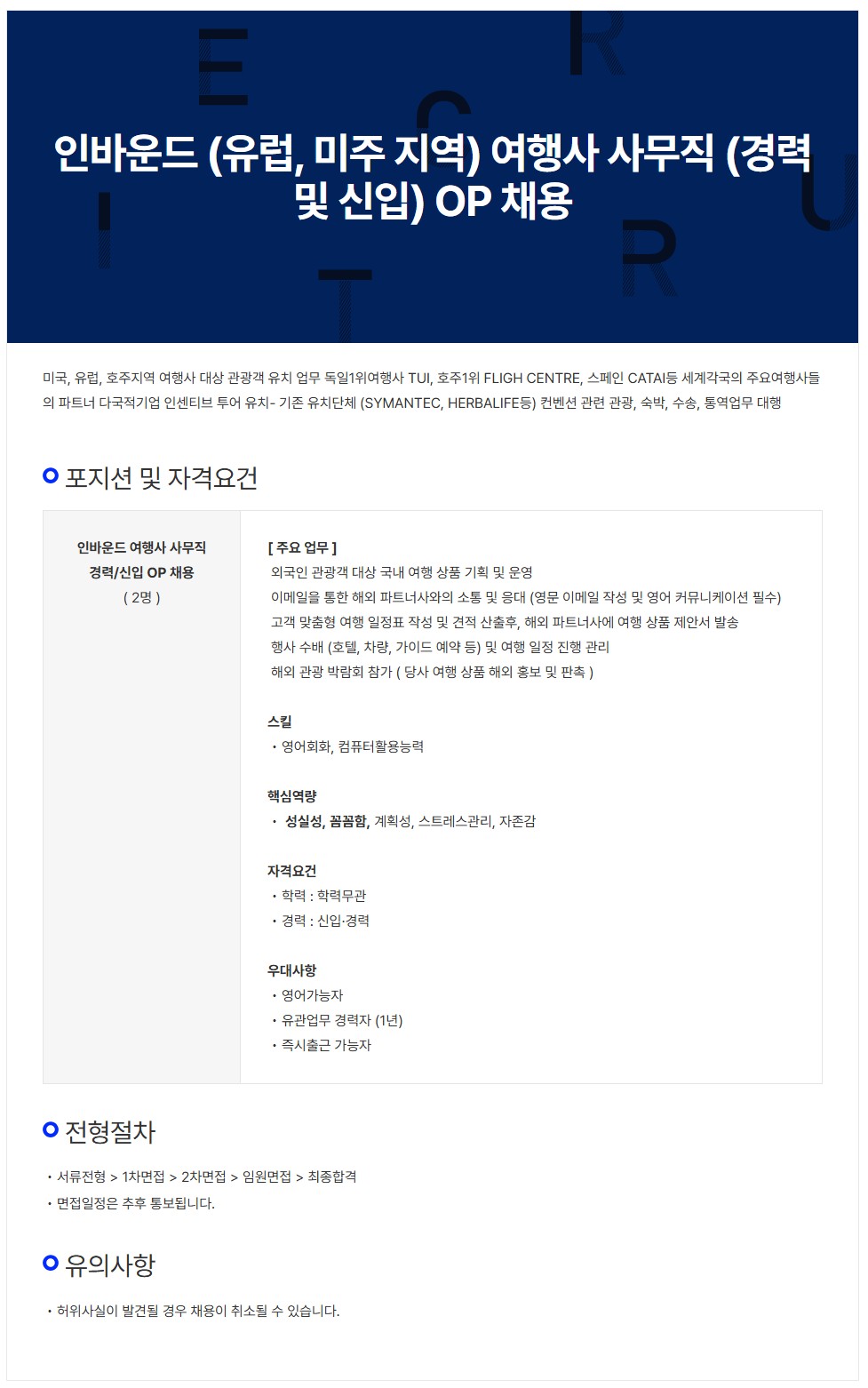 [할리데이플래너스여행㈜] 인바운드 (유럽, 미주 지역) 여행사 사무직 OP 채용