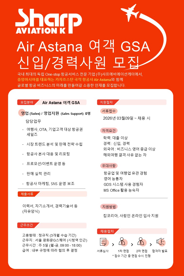 [㈜샤프에비에이션케이] Air Astana 항공사 여객 GSA 영업 및 영업지원 모집
