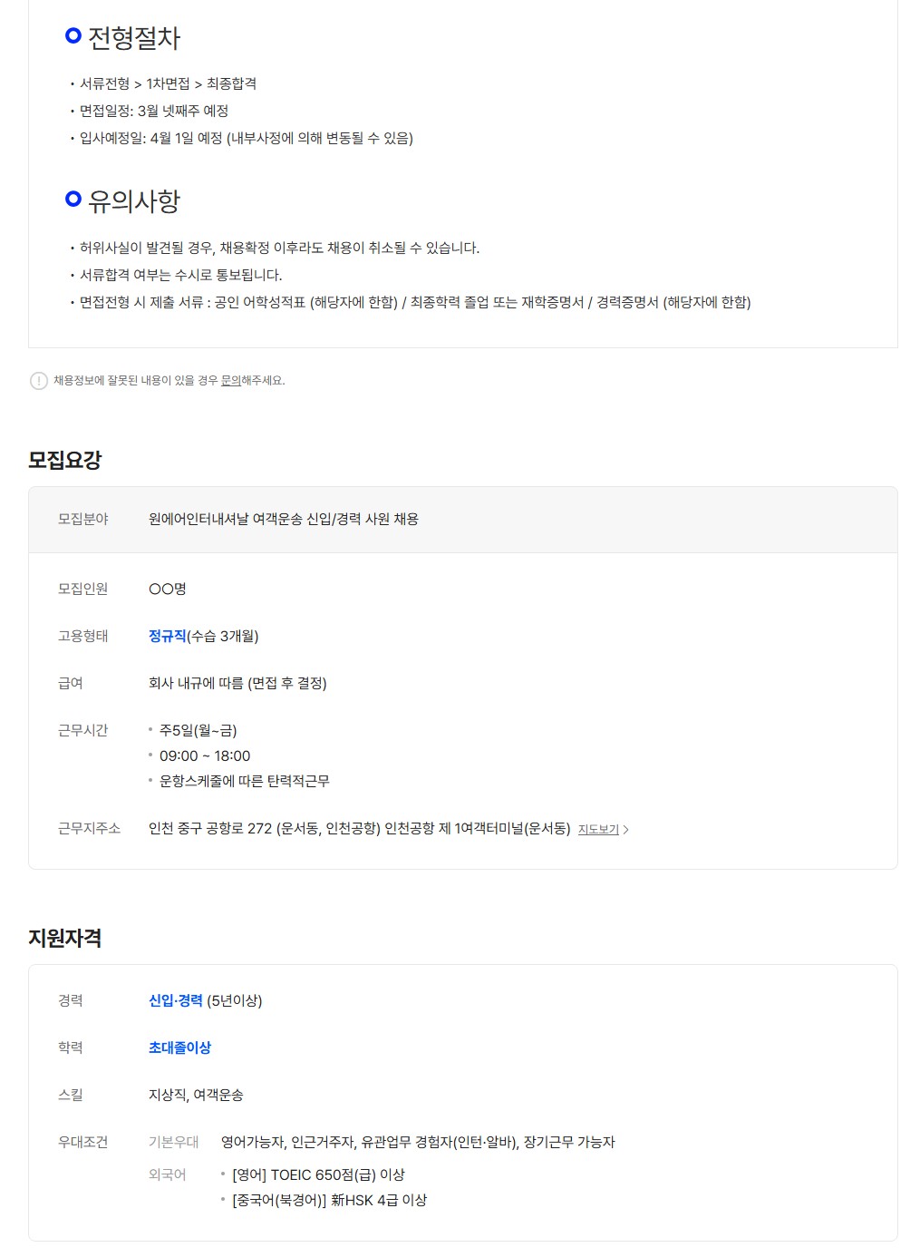 [원에어인터내셔날] 에어프레미아 여객운송 신입 및 경력 사원 채용