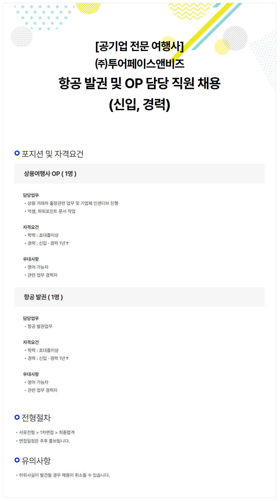 [㈜투어페이스앤비즈] 항공 발권 및 OP 담당 직원 채용 (신입, 경력)