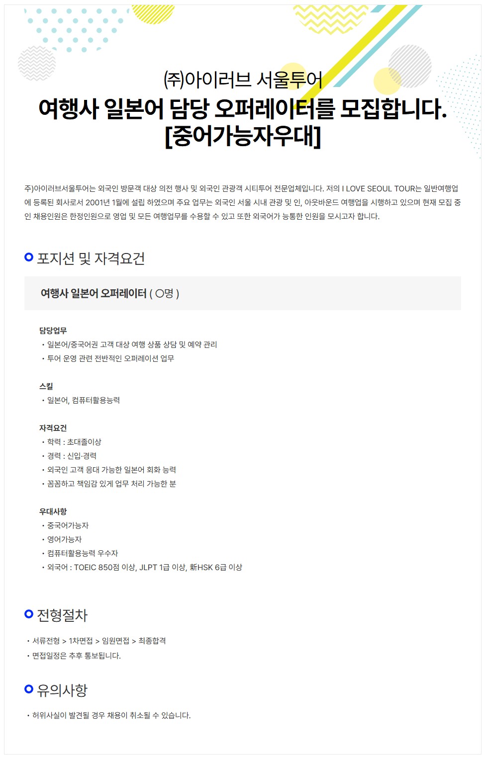 [㈜아이러브 서울투어] 여행사 일본어 담당 OP 모집 [중어가능자우대]