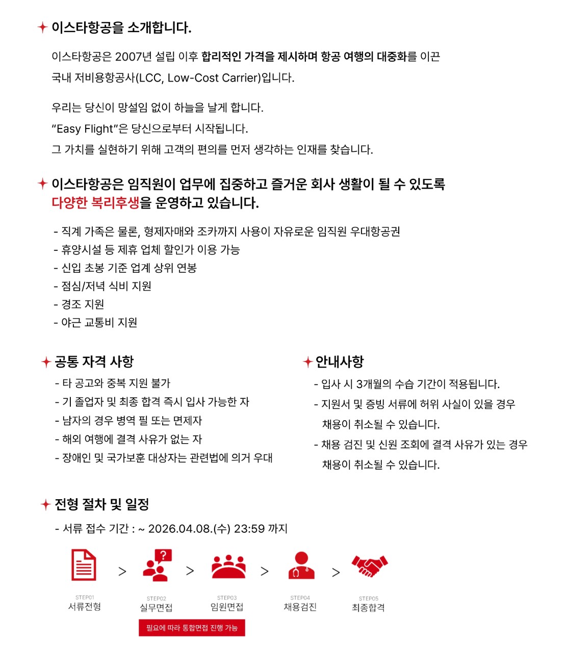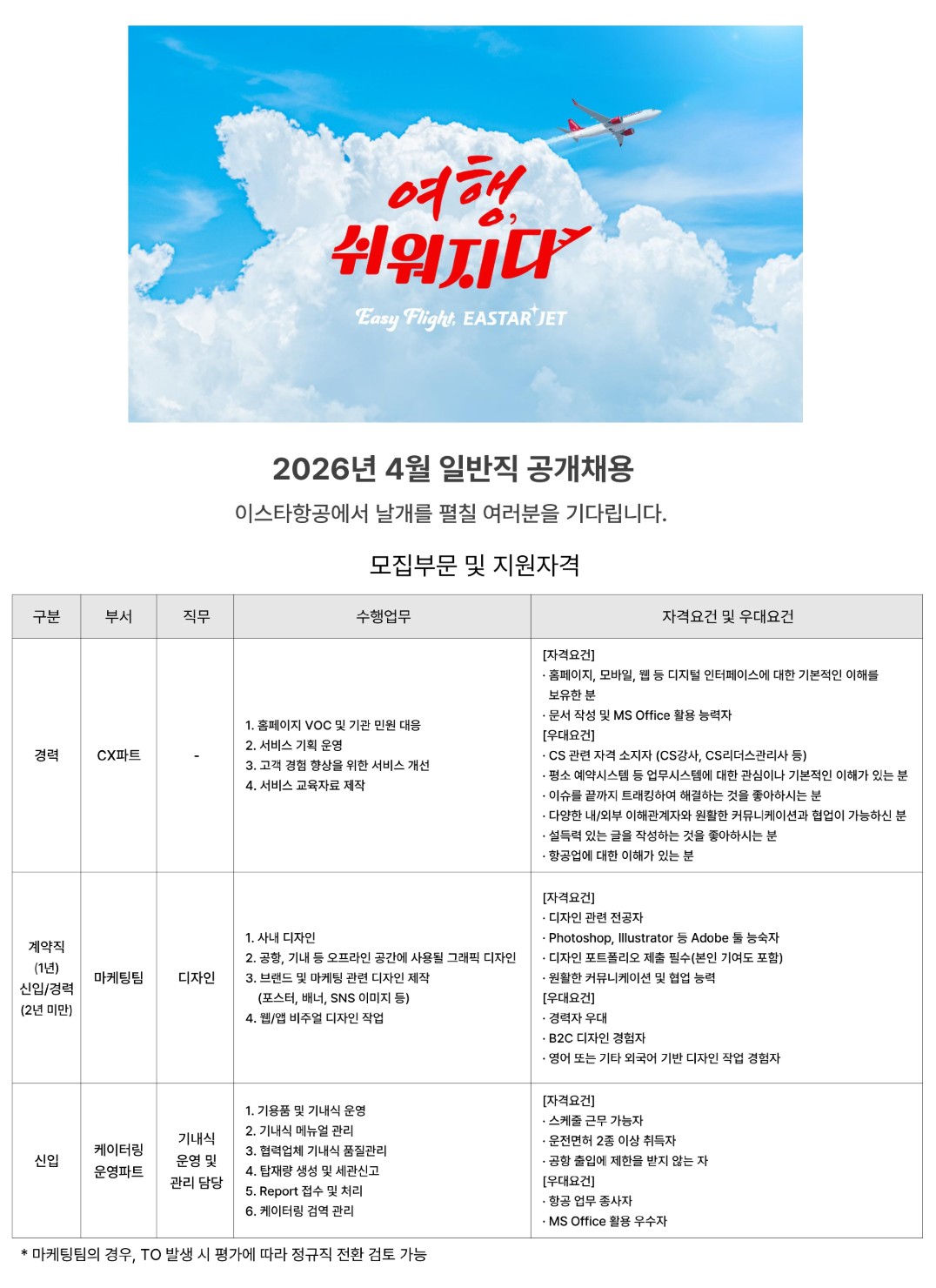 [이스타항공] 2026년 4월 일반직 공개채용(CX파트, 마케팅팀, 케이터링운영파트)