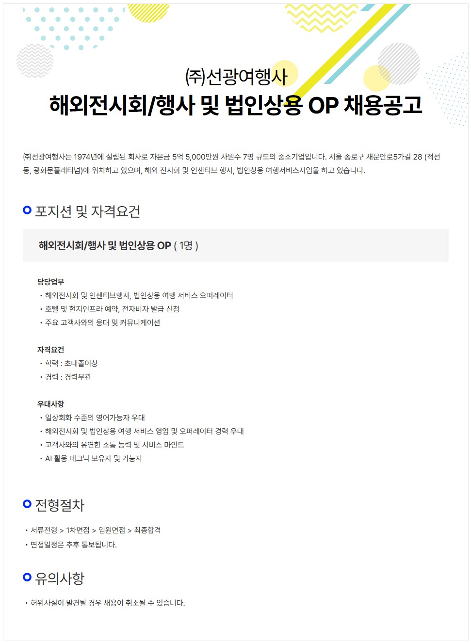 [㈜선광여행사] 해외전시회/행사 및 법인상용 OP 채용공고